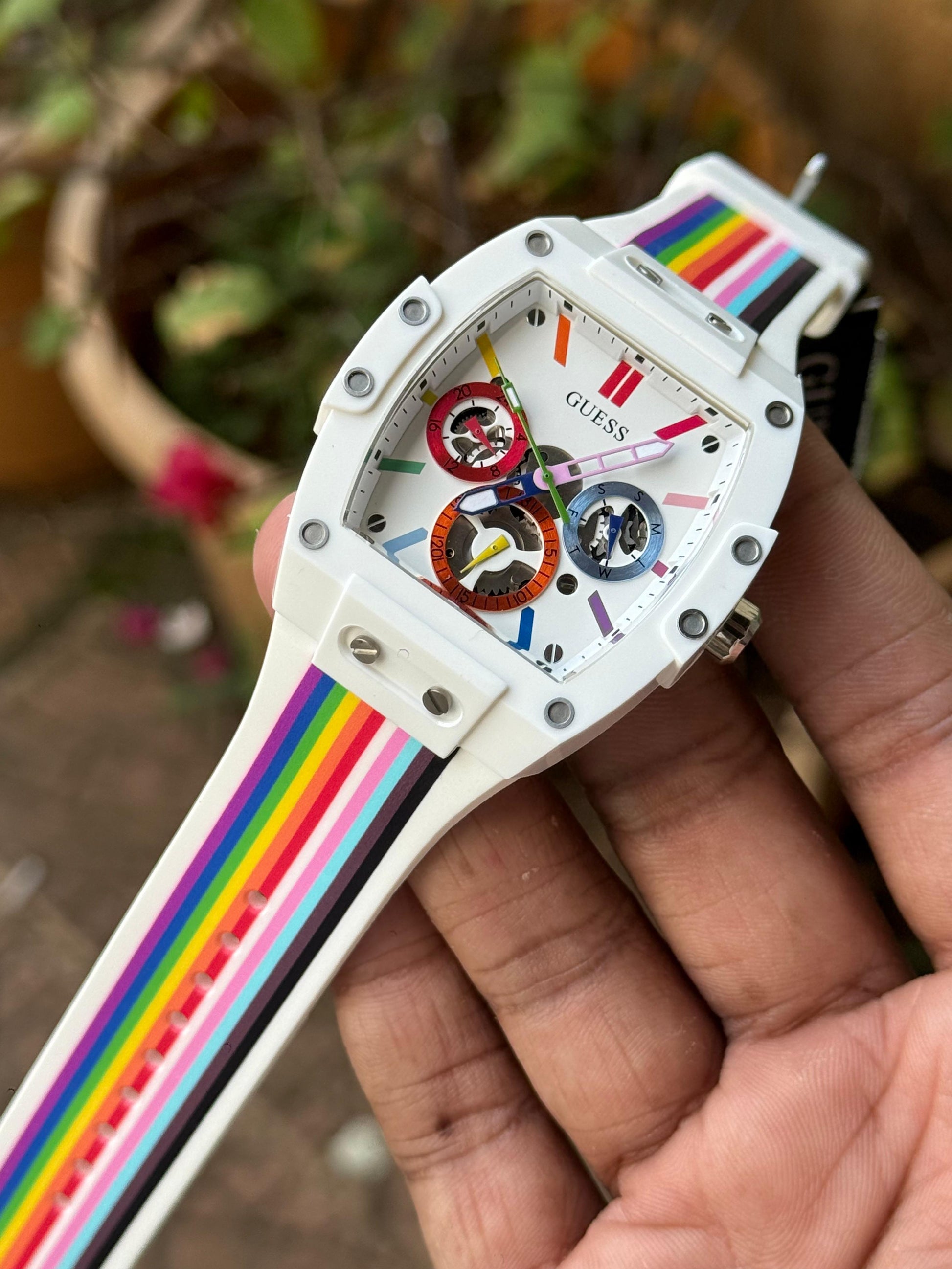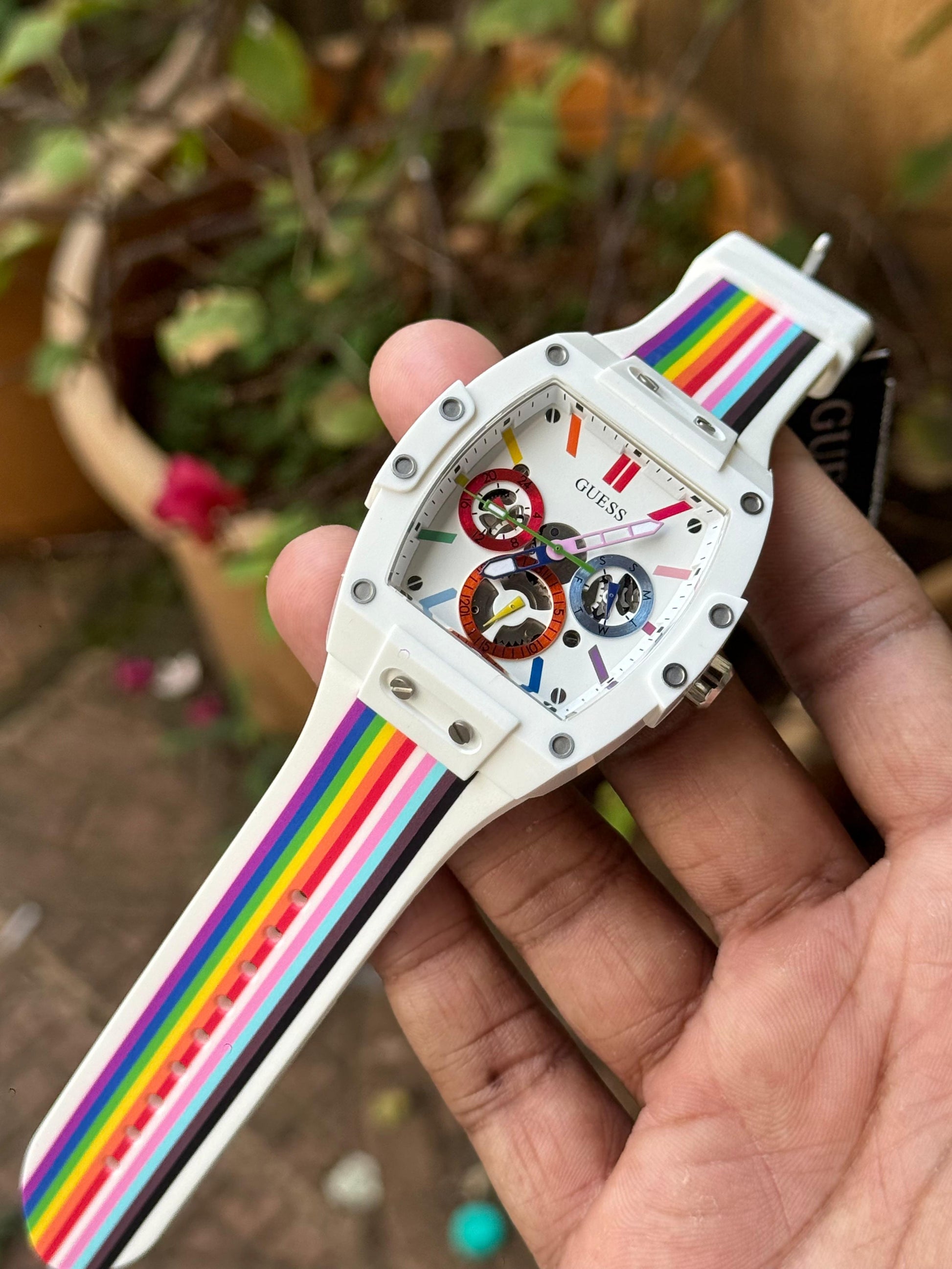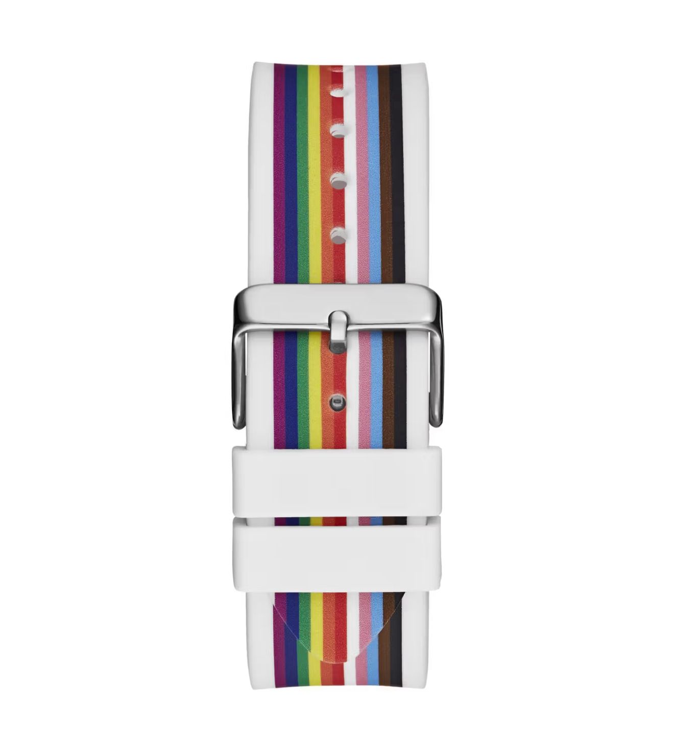 Strap Color / Design: White / multicolor rainbow stripe / LGBTQ+ inclusivity flag design